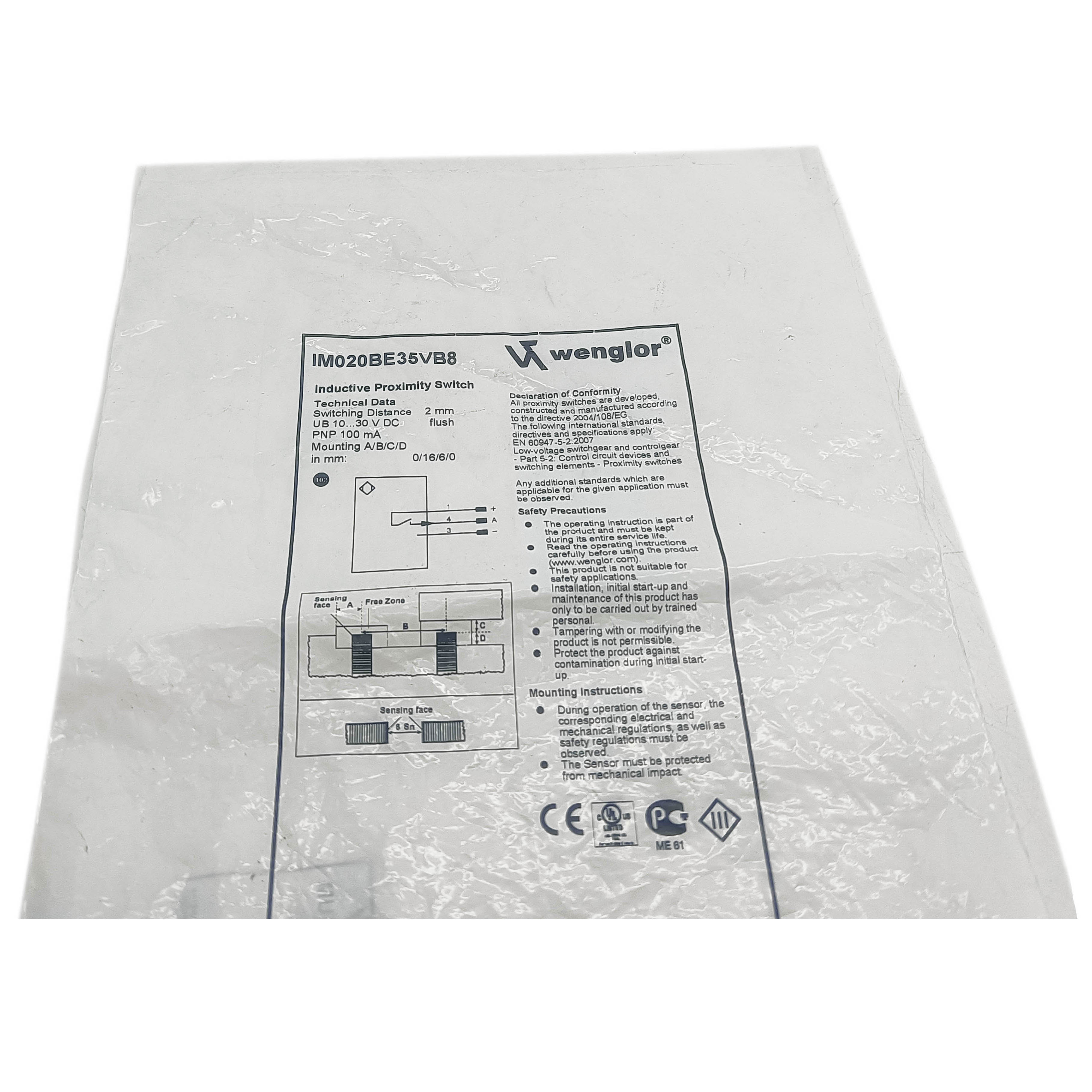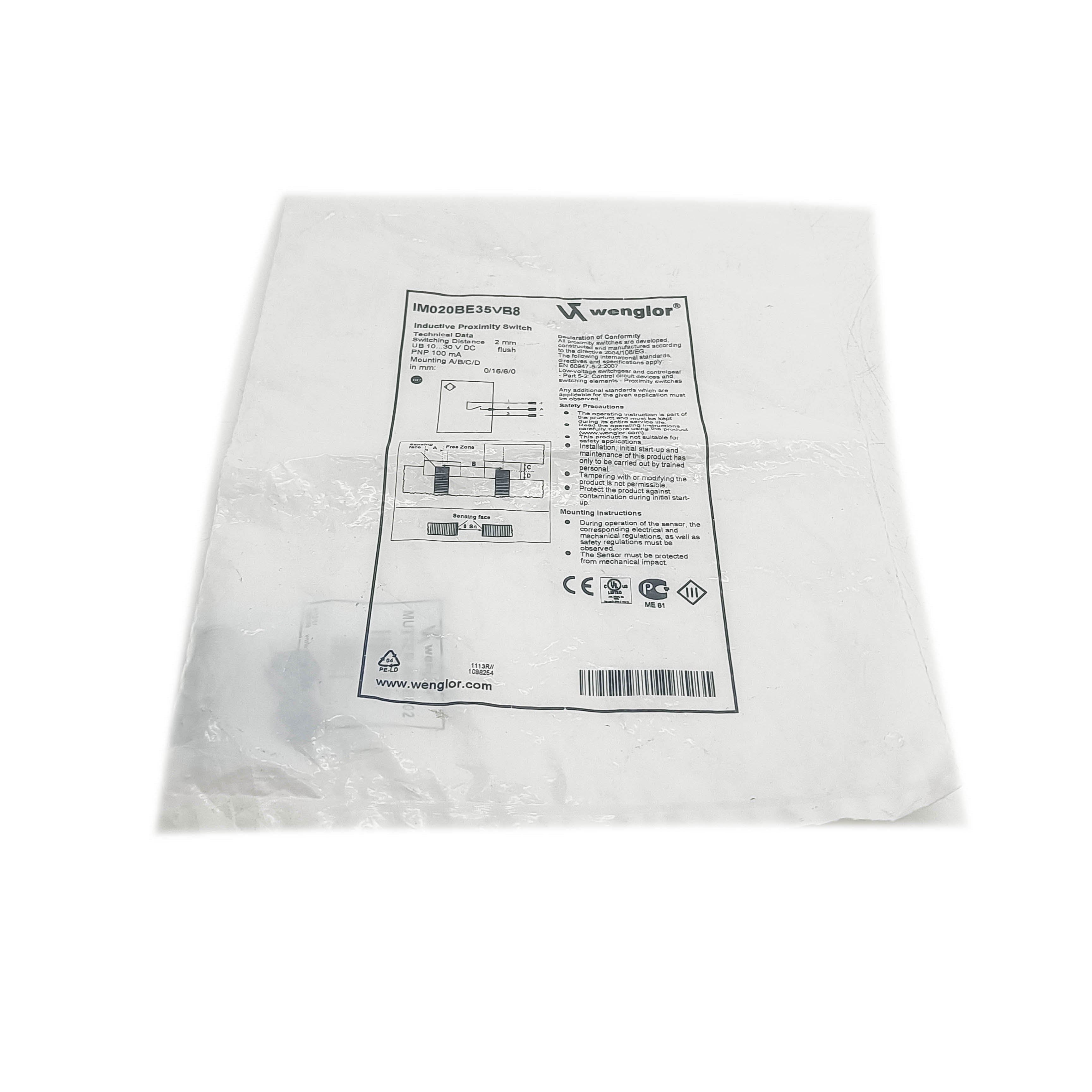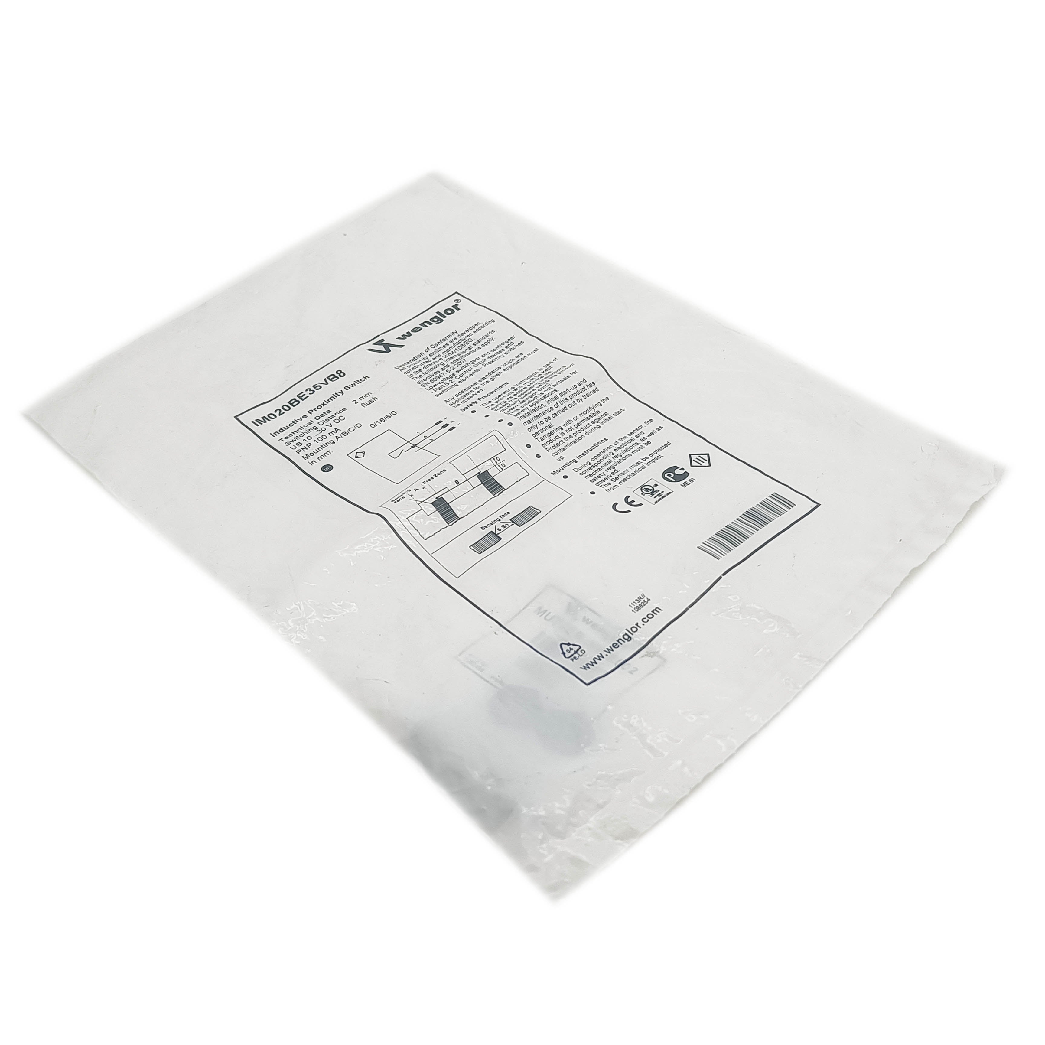 The Wenglor IM020BE35VB8 is a precision PNP proximity switch sensor engineered for industrial automation applications. This compact sensor delivers reliable non-contact detection with a 20mm sensing range, making it ideal for position monitoring, object counting, and material detection tasks. Built with robust construction and IP67 rating, it withstands harsh manufacturing environments while maintaining consistent performance. The PNP output configuration ensures seamless integration with standard industrial control systems and PLCs. Features adjustable sensitivity for fine-tuned detection accuracy across varying material types. Perfect for assembly lines, packaging equipment, and automated machinery requiring dependable proximity sensing solutions.