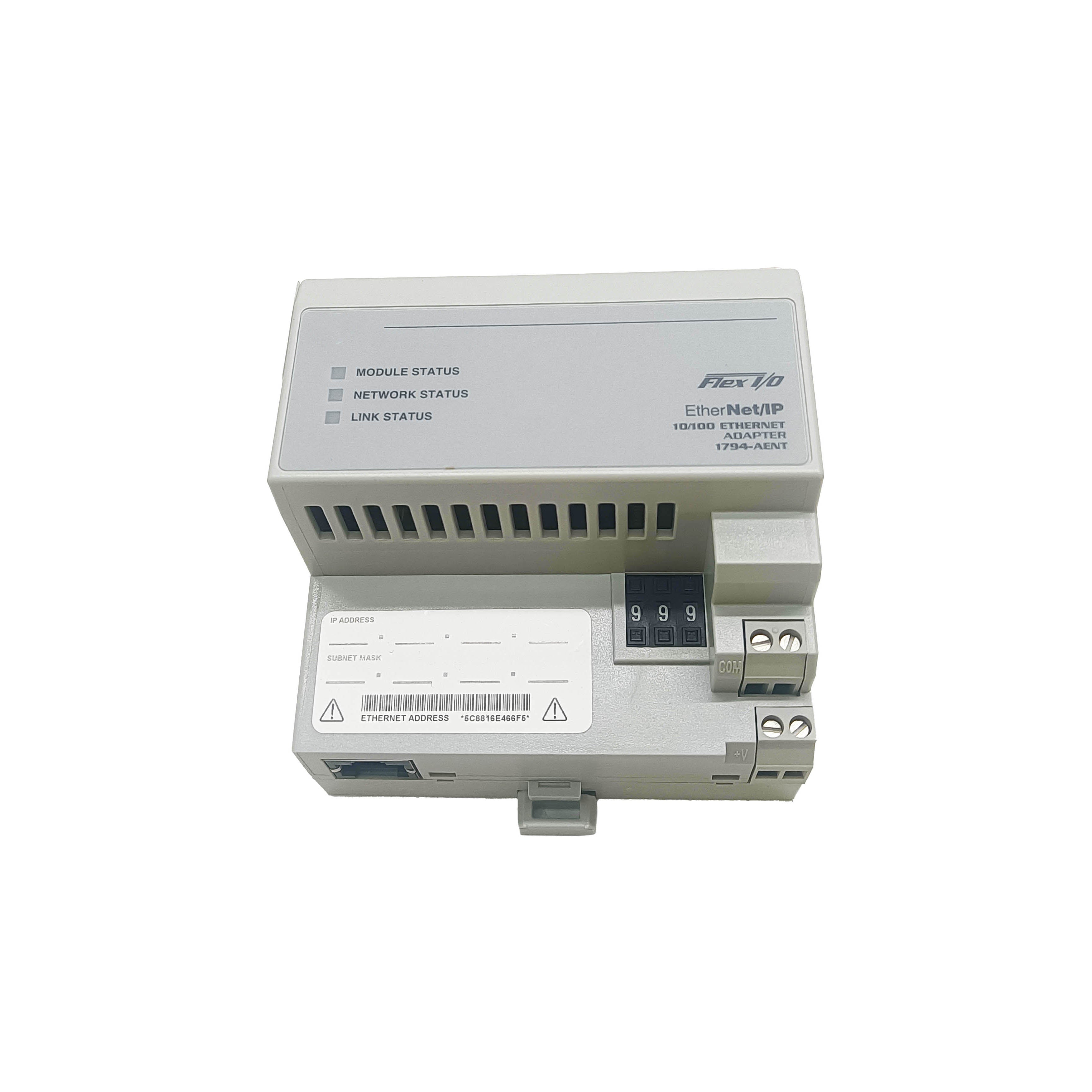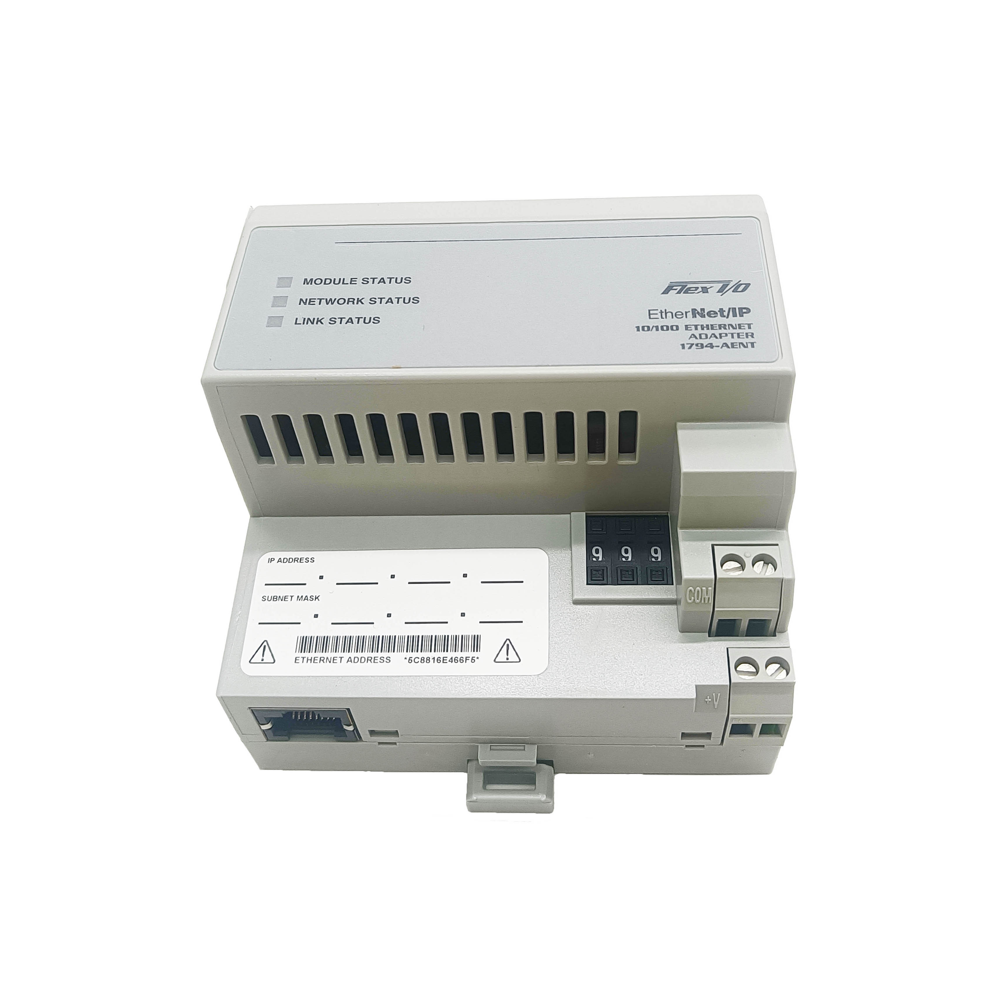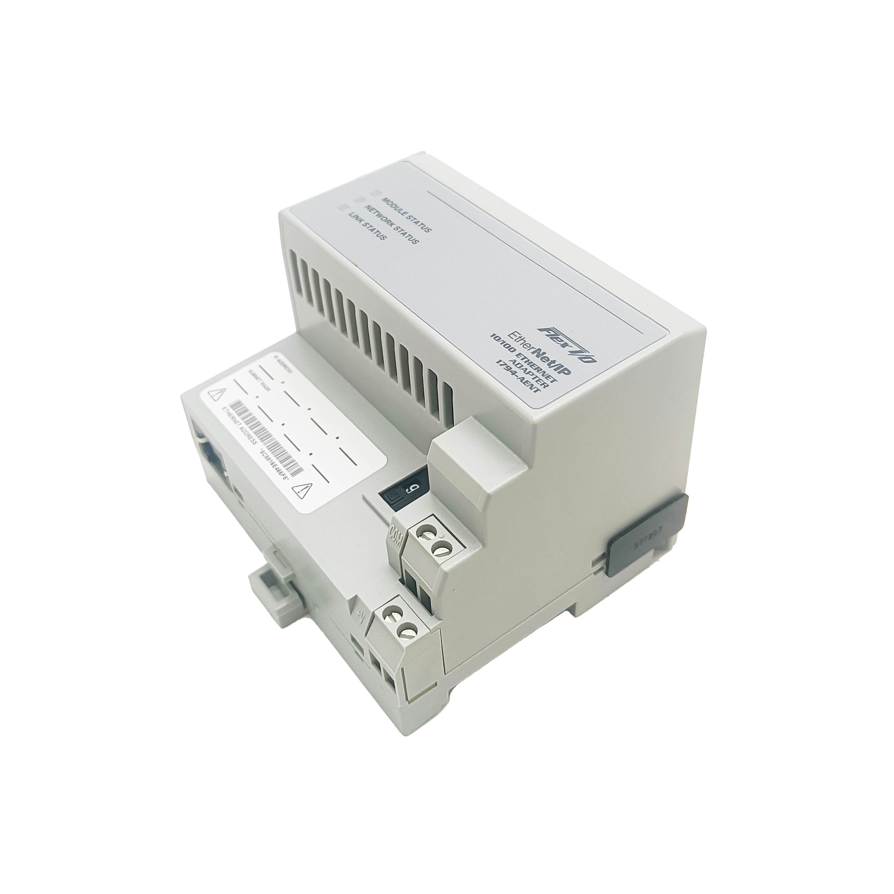 The 1794-AENT Ser A Flex I/O Ethernet/IP Adapter Module from Allen-Bradley enables seamless integration of Flex I/O systems into Ethernet/IP networks. Designed for reliable industrial communication, it facilitates efficient data exchange and simplifies control system expansions. This adapter ensures real-time performance and robust connectivity, making it ideal for demanding automation applications requiring precise control and monitoring over Ethernet/IP infrastructure.