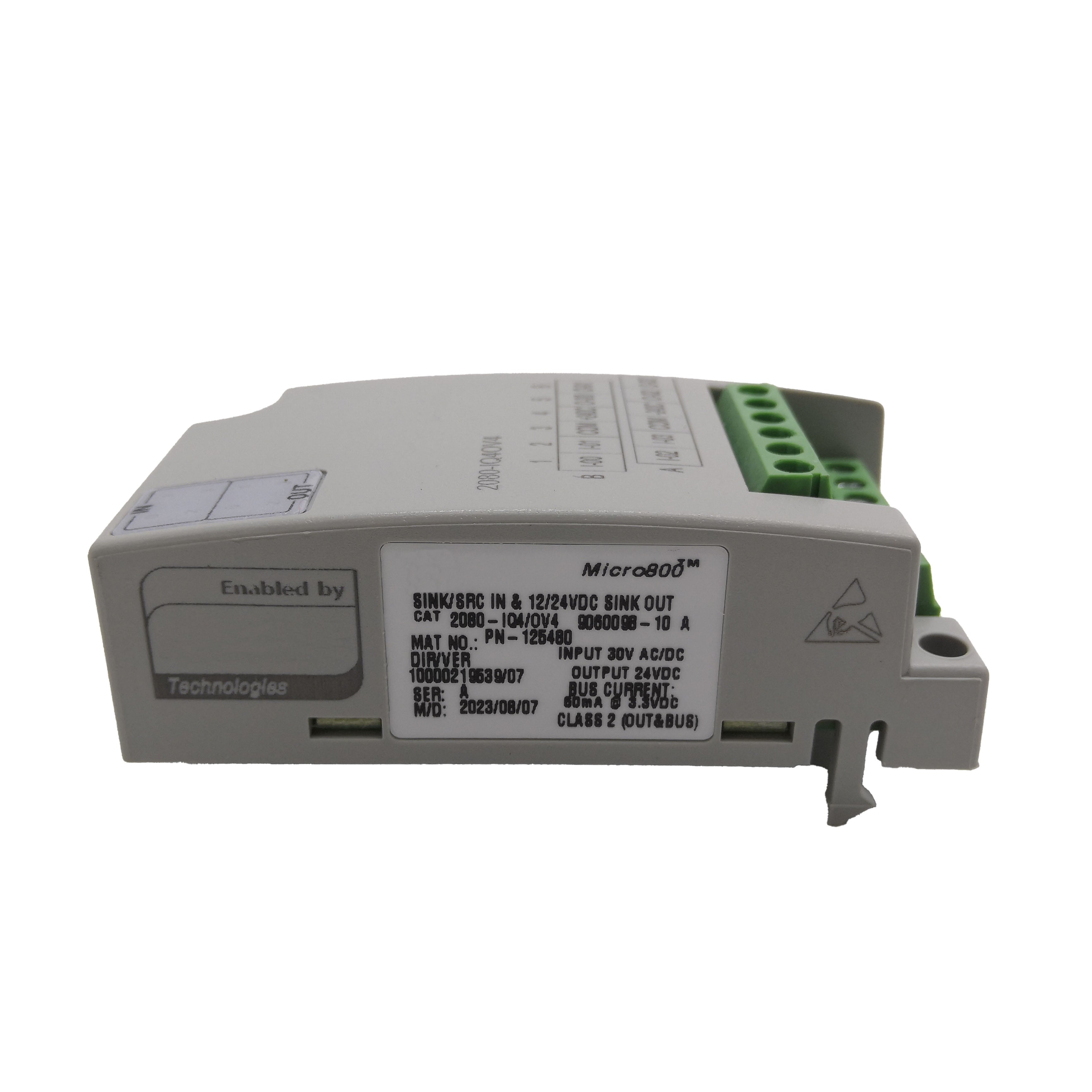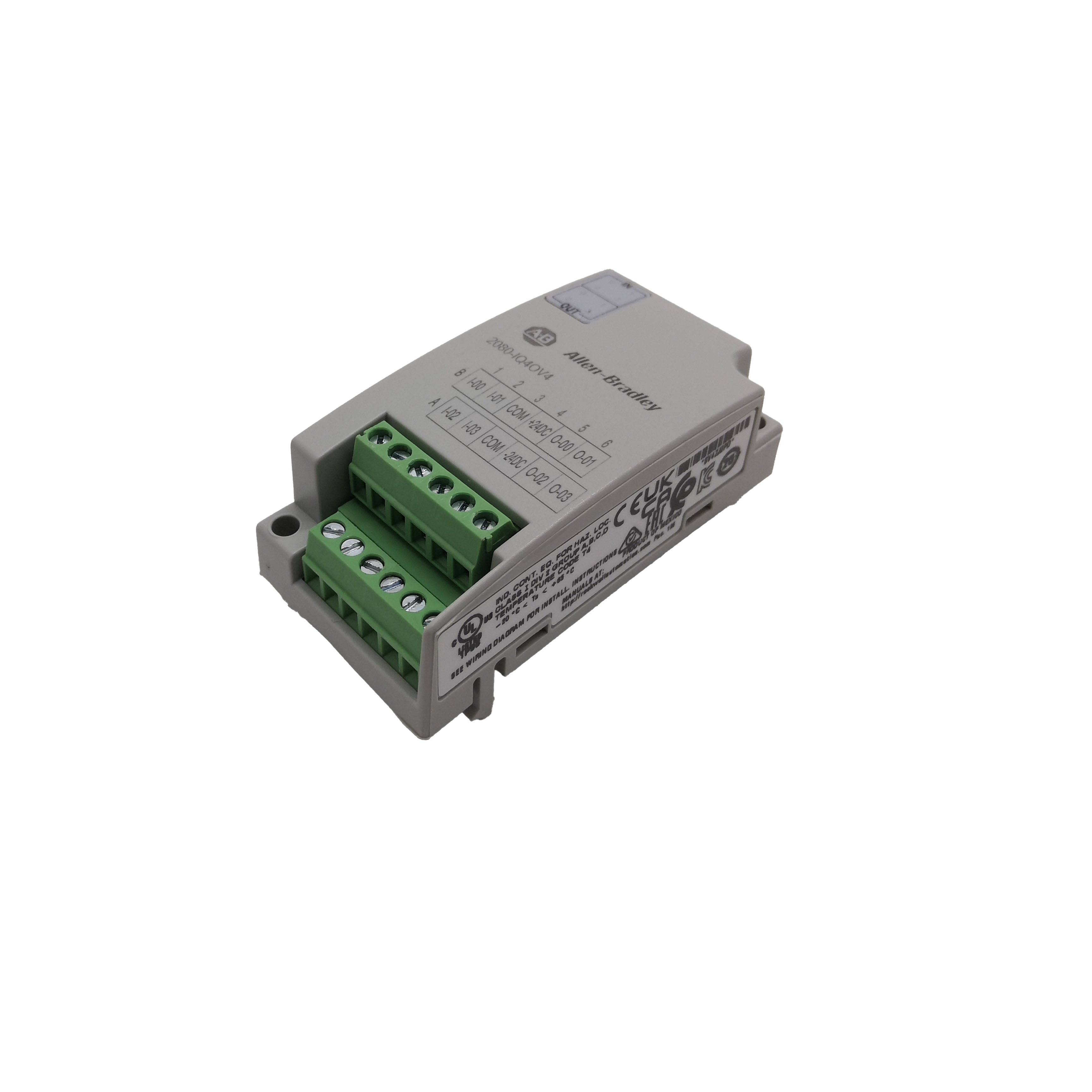The Allen-Bradley 2080-IQ4OV4 is a compact digital I/O expansion module designed for the Micro800 PLC family.