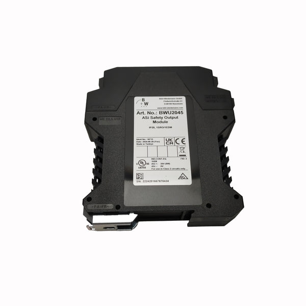 The BWU2045 is a precision safety relay output module engineered for industrial automation systems requiring certified safety functionality. This original B+W component delivers reliable signal switching with integrated safety protocols, ideal for machinery control, emergency stop circuits, and protective interlocking applications. Built to stringent industrial standards, it ensures dependable performance in demanding manufacturing environments. Compatible with standard safety relay architectures, the BWU2045 provides the redundancy and fail-safe operation critical to modern industrial safety systems.